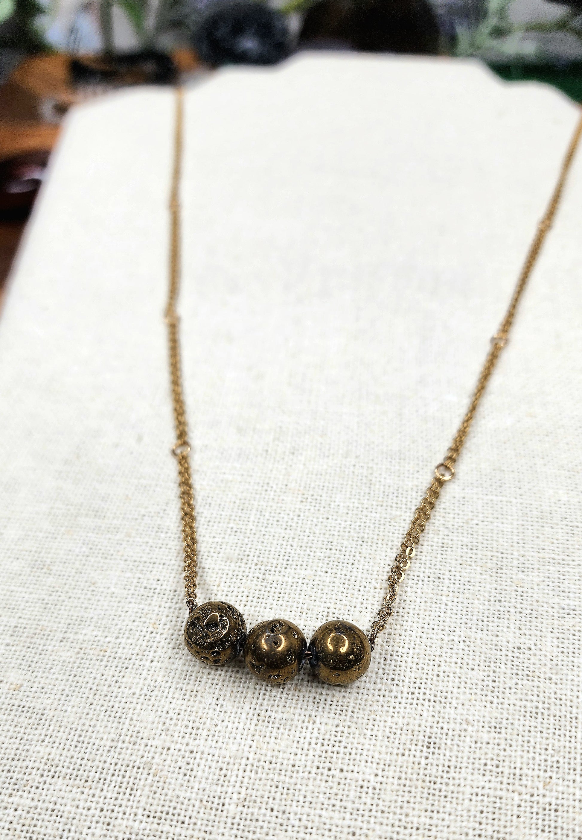 💛 This simple yet stylish necklace features 3 golden druzy Agate beads. It has a double gold stainless steel chain decorated with loops all the way around. There is no clasp, so this style goes on over the head.